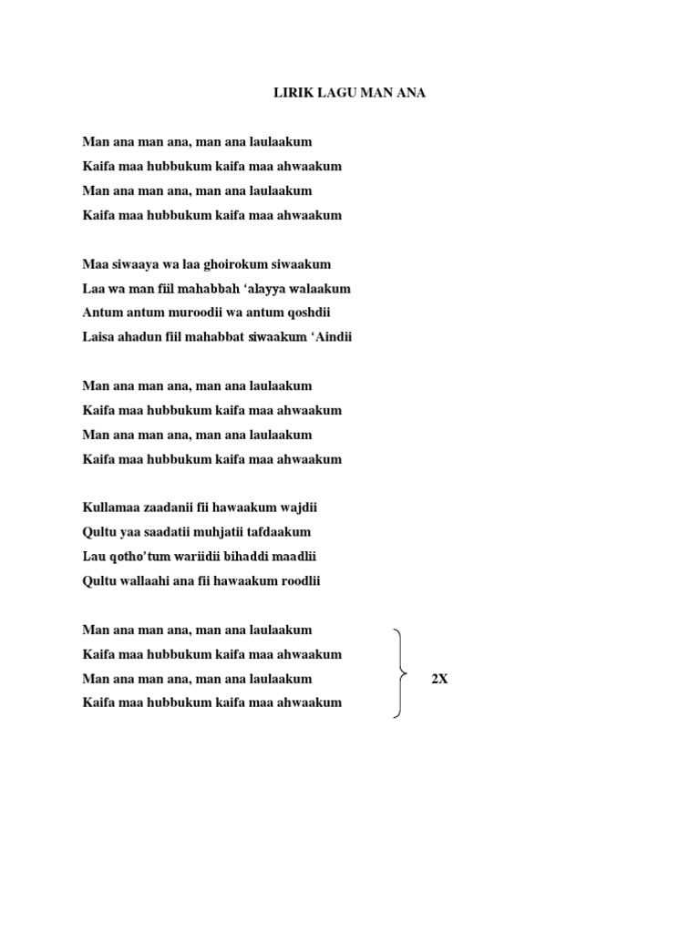 Yuk simak lirik lagu man ana indonesia Dibawah ini adalah lirik lagu Man Ana versi Az Zahir sebuah grup hadroh dari Pekalongan. Lihat juga:ayat dan lirik lagu man ana indonesia